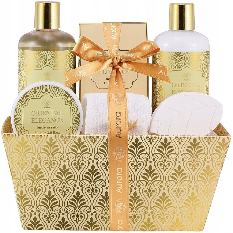 Conținutul setului: Gel de duș Aurora Oriental Elegance, 300ml + Loțiune de corp Aurora Oriental Elegance, 300ml + Scrub de corp Aurora Oriental Elegance, 60ml + Sare de baie Aurora Oriental Elegance, 150g + Bombă de baie Aurora Oriental Elegance, 50g + Prosop de față