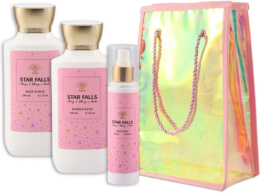Conținutul Setului: Scrub de Corp - Scrub de Corp Aurora Star Falls Peony And Cherry, 240ml + Spumant de Baie - Spumant de Baie Aurora Star Falls Peony And Cherry, 240ml + Spray de Corp - Spray de Corp Aurora Star Falls Peony And Cherry, 150ml + Geantă
