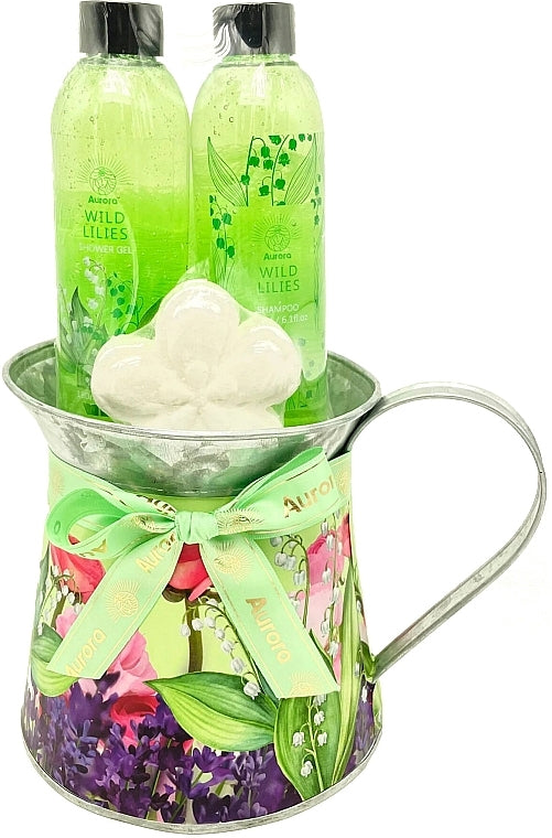 Setul include: Gel de duș Aurora Lăcrămioare Sălbatice, 180 ml + Șampon Aurora Lăcrămioare Sălbatice, 180 ml + Bombă de baie Aurora Lăcrămioare Sălbatice, 30 g + Sticlă, 1 buc